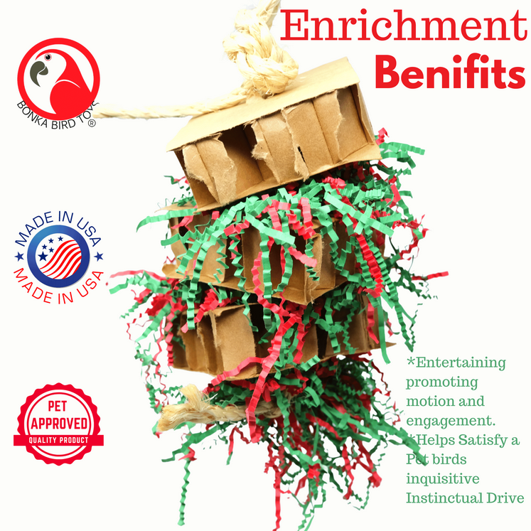 Bring a festive, interactive touch to your bird’s cage with this Medium Christmas Square Gift Box! Three cardboard blocks wrapped in holiday-themed shreddy paper form the heart of the toy, giving your bird plenty to peck, chew, and explore. Lightweight yet engaging, it promotes natural foraging and chewing behaviors — perfect for medium to large parrots during the holiday season.