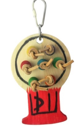 A&E Happy Beaks Small Gumball Machine features a wooden plank in the shape of a gumball machine with leather rope pulls. The small gumball machine measures approx imately at 3inx 6in and is perfect for small bird types such as Parakeets, Canaries and Lovebirds.