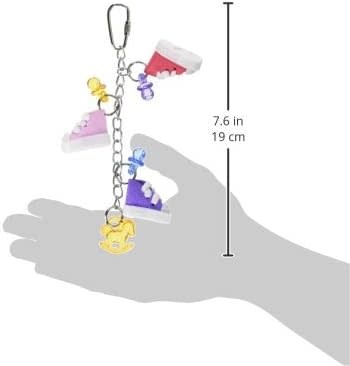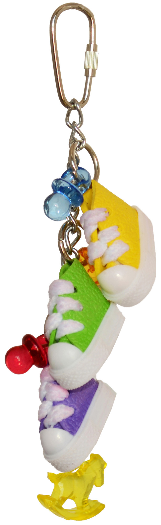 Darling little baby sneakers and pacifier beads hang from chain with a cute rocking horse. Great for a small bird.