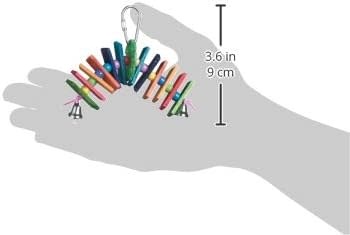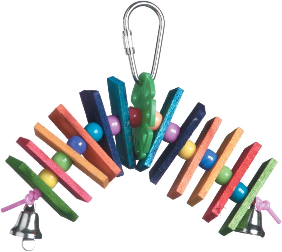 DESIGN FEATURES - Small birds will enjoy chewing the brightly colored, soft balsa wood used to make this arch-shaped bird toy. Two shiny bells and acrylic beads also add to the fun. Attaches to the cage with a bird-safe pear link.