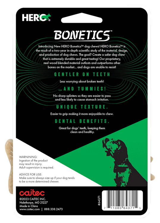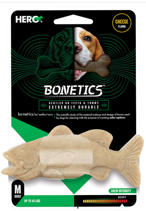 Hero Bonetics is the result of a two-year in-depth scientific study of the material, design, and production of dog chews. The goal? Create a safer dog chew that is extremely durable and great tasting! Our proprietary, real wood-blended nylon material outlasts and outperforms other bones on the market, and dogs are unable to resist! The Bonetics Fish Chew features a delicious cheese flavor that dogs love. Great for heavy chewers and the medium size is recommended for dogs up to 45 lbs.