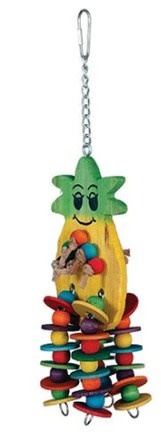 Pineapple Bird Toy Medium starts with a large piece of wood cut and colored to look like a pineapple. Combination of hard and soft wood and leather promotes chewing.