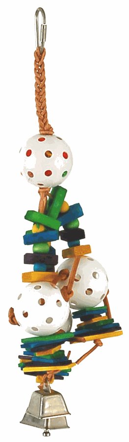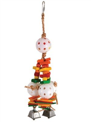 Small Batter Up toy is sure to be a hit for medium sized feathered friends! This toy is loaded with colors and textures that make this toy fun and safe for chewing, tugging, and pulling. We added BPA-free plastic wiffle balls, naturally dyed-wood, and leather strips. We also added bells at the end for extra excitement and stimulation. The quick link allows the toy to attach to virtually any birdcage. We also offer the regular Batter Up and the Large Batter Up for different sized birds.