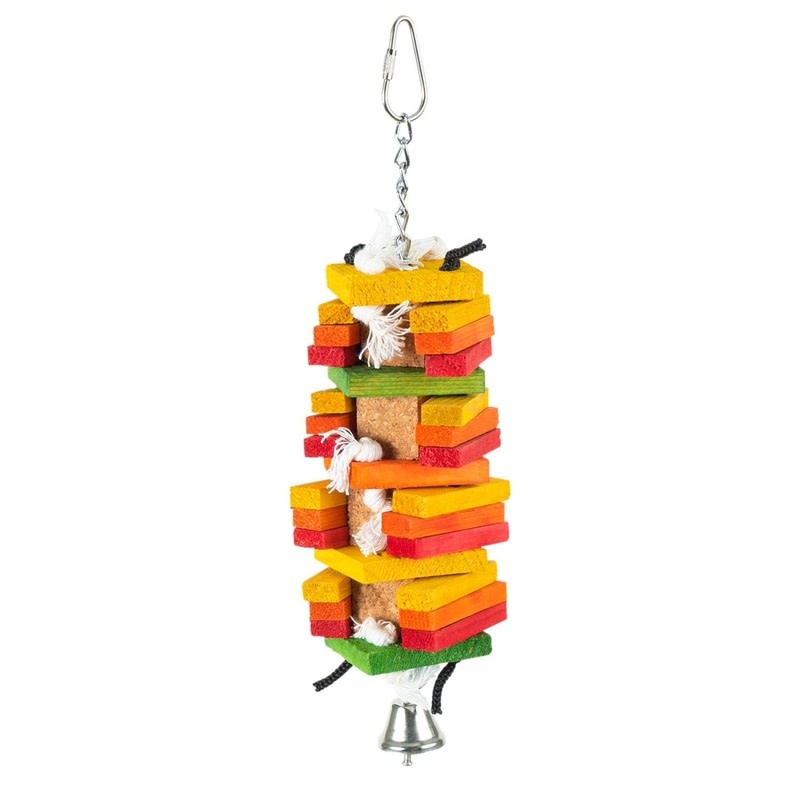 Featherland Paradise Cork Center Block Bird Toy has a centre chain with stacked cork blocks down a centre column, surrounded on two sides by stacked colourful wood slats and cotton rope knots. Multi-material and texture for destructive parrots.