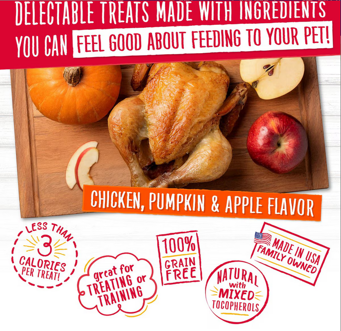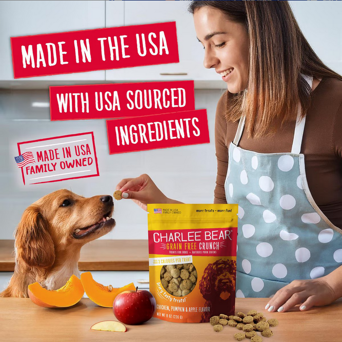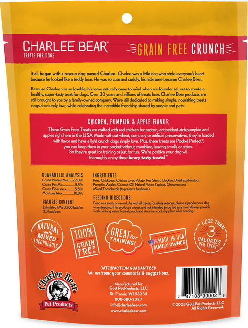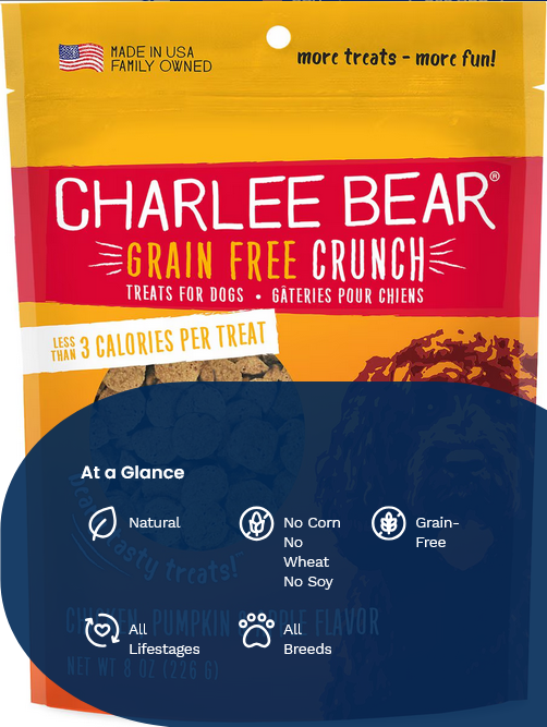 Give your dog the flavor-packed, natural taste of home with Charlee Bear Natural Bear Crunch Chicken, Pumpkin & Apple Grain-Free Dog Treats. They're made with real, wholesome ingredients, just like mom's homemade biscuits! Great for small dogs, large dogs and all dogs in between, you can use them to treat your dog anytime—whether you're congratulating them for great behavior or just saying, "I love you!" Plus, they're perfect for training because they're stain, smell, and grease free—which makes them pocket perfect, so you can be ready to reward anytime.