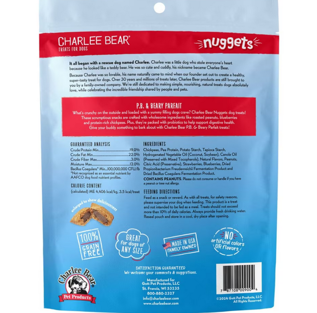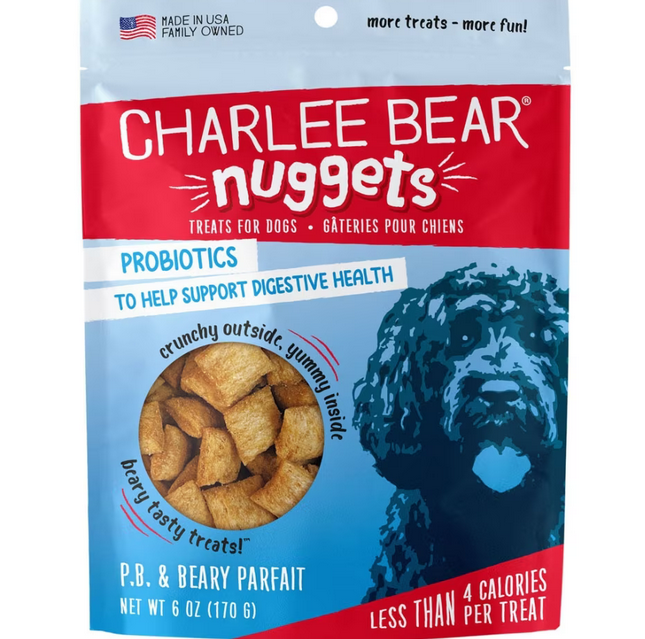 For a healthy and delicious way to reward your pup, try Charlee Bear Nuggets PB & Beary Parfait Crunchy Dog Treats. These functional dog treats pack a flavorful punch in every bite. Charlee Bear Nuggets are naturally low in calories for guilt-free snacking. They also feature a soft center and satisfying crunch that dogs can’t resist. Use them during training or feed them as a just-because treat. Charlee Bear Nuggets are made in the USA with wholesome ingredients that dogs love and paw-rents can feel good about. Indulge your doggy’s taste buds with Charlee Bear Nuggets!