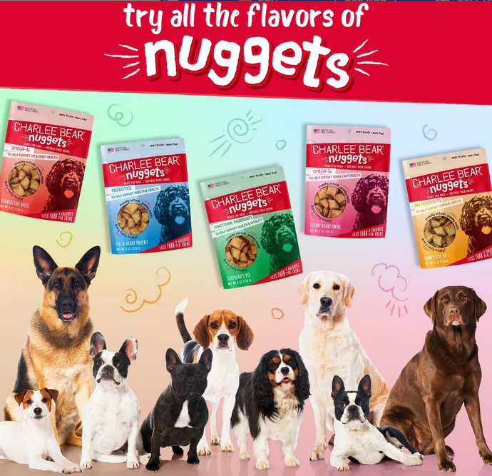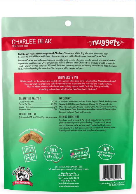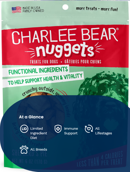 For a healthy and delicious way to reward your pup, try Charlee Bear Nuggets Shepherd’s Pie Crunchy Dog Treats. These functional dog treats pack a flavorful punch in every bite. Charlee Bear Nuggets are naturally low in calories for guilt-free snacking. They also feature a soft center and satisfying crunch that dogs can’t resist. Use them during training or feed them as a just-because treat. Charlee Bear Nuggets are made in the USA with wholesome ingredients that dogs love and paw-rents can feel good about. Indulge your doggy’s taste buds with Charlee Bear Nuggets!