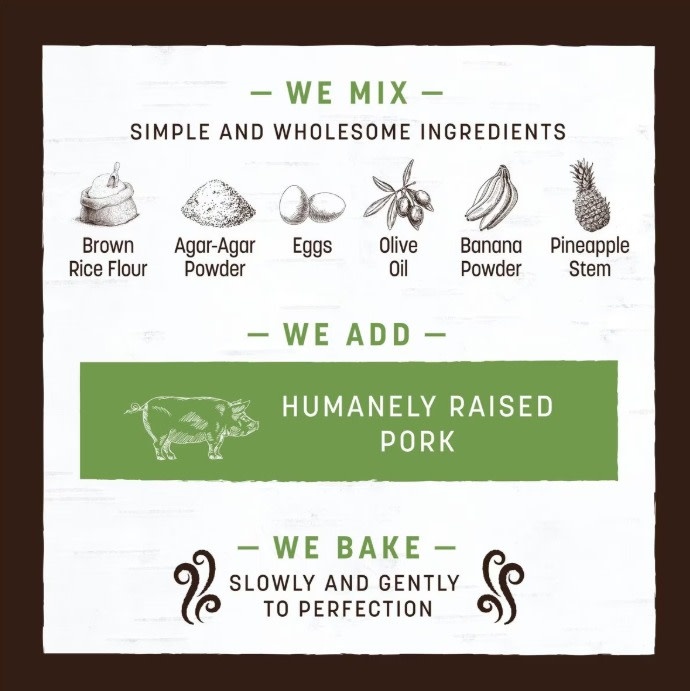 Pork, Brown Rice Flour, Agar-Agar, Eggs, Olive Oil, Banana Powder, Pineapple Stem.
