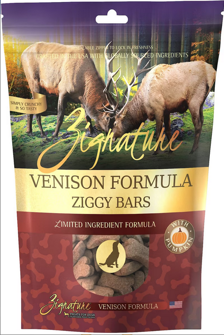 Make snack time more satisfying with Zignature Venison Formula Ziggy Bars Biscuit Dog Treats! These bone-shaped biscuits feature real, high quality venison as the number one ingredient. The limited-ingredient recipe is also packed with pumpkin—so they’re great for dogs with sensitive stomachs. Each bone is cooked to paw-fection with a crunchy texture dogs love. Plus, they’re easy to break in half for use during training!