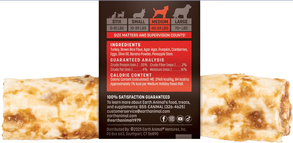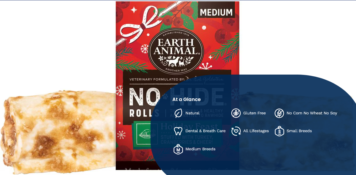 Treat your pup to a gnaw-some, 100% rawhide-free chew with Earth Animal No-Hide Seasonal Holiday Feast Turkey Recipe Rolls Dog Chew. This natural, easy-to-digest treat is veterinarian-formulated and made in the USA without synthetic chemicals, additives, bleaches, or formaldehydes. Each chew features simple, delicious ingredients you can recognize, like real turkey, pumpkin, and cranberry. Plus, it promotes good oral hygiene with every bite!