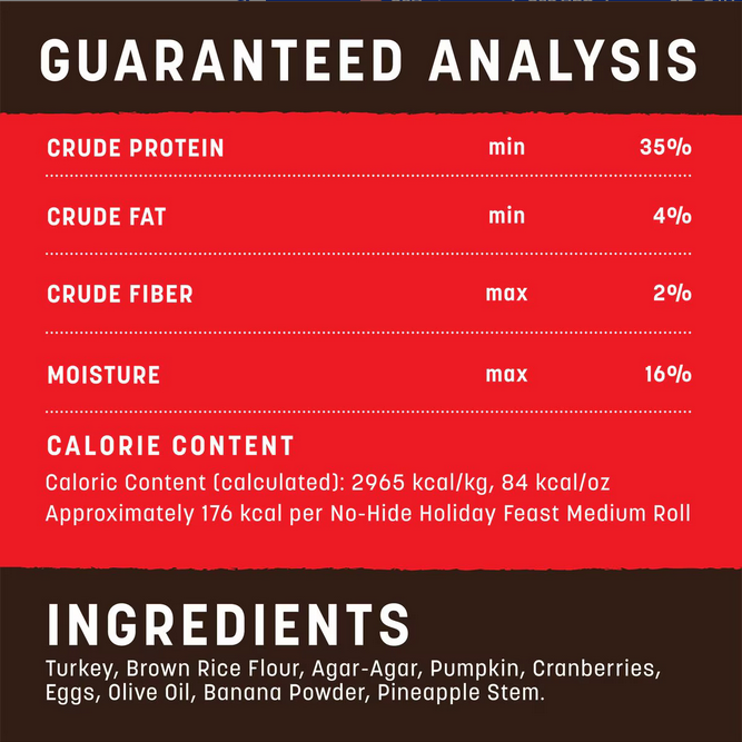 Turkey, Brown Rice Flour, Agar-Agar, Pumpkin, Cranberries, Eggs, Olive Oil, Banana Powder, Pineapple Stem.