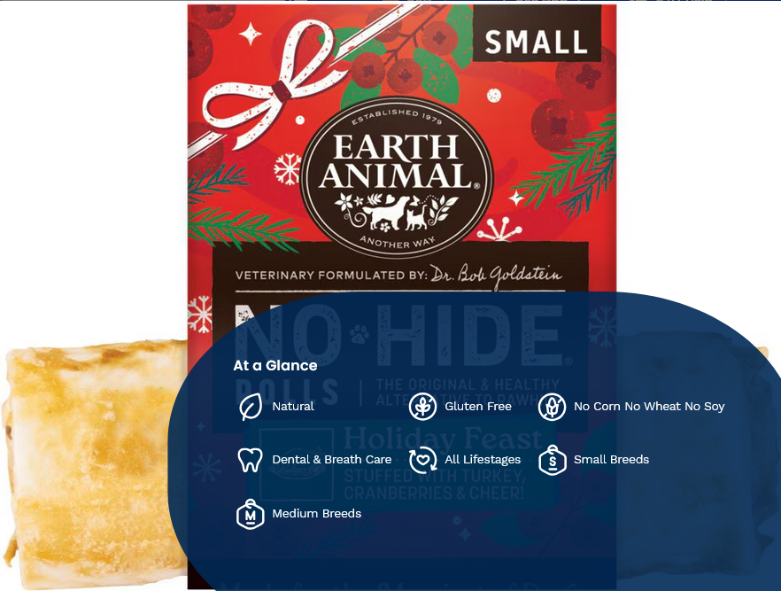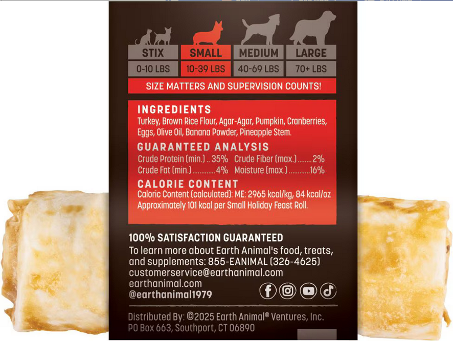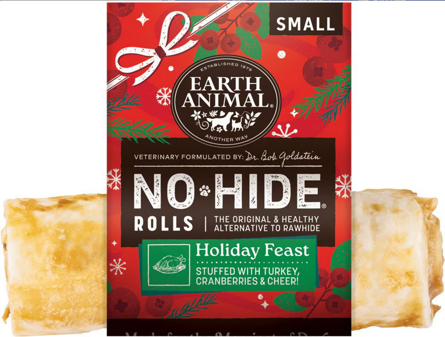 Treat your pup to a gnaw-some, 100% rawhide-free chew with Earth Animal No-Hide Seasonal Holiday Feast Turkey Recipe Rolls Dog Chew. This natural, easy-to-digest treat is veterinarian-formulated and made in the USA without synthetic chemicals, additives, bleaches, or formaldehydes. Each chew features simple, delicious ingredients you can recognize, like real turkey, pumpkin, and cranberry. Plus, it promotes good oral hygiene with every bite!