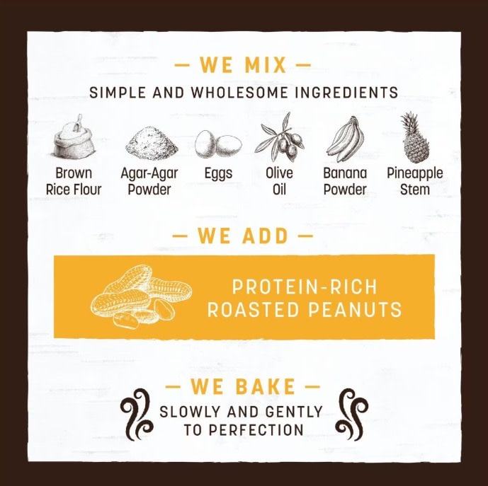 Brown Rice Flour, Peanut Butter Powder, Agar-Agar, Eggs, Olive Oil, Banana Powder, Pineapple Stem.