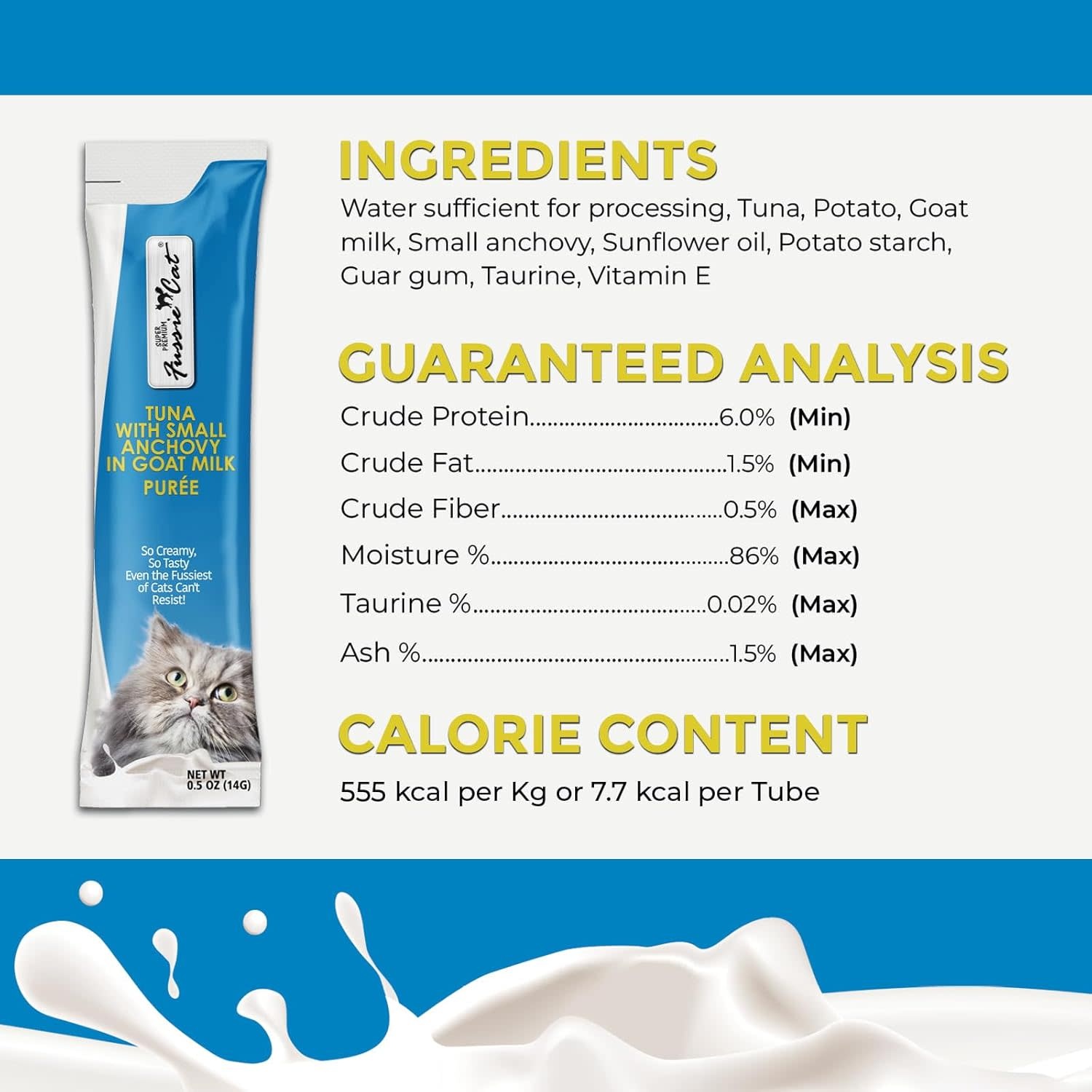 Fussie Cat Premium Tuna with Small Anchovies in Goat Milk Puree, lickable cat Treats, 0.5oz Pouch Pack of 4