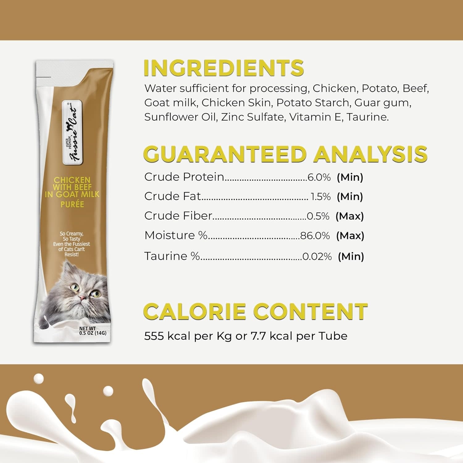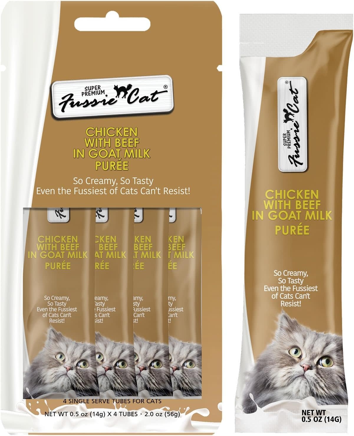 Fussie Cat Super Premium Chicken with Beef in Goat Milk Puree, lickable cat Treats, 0.5oz Pouch Pack of 4