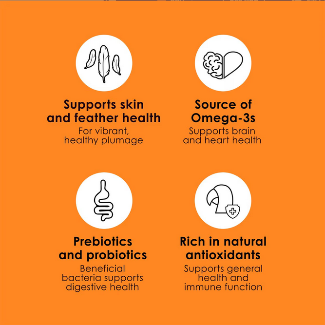 Sunflower Seed, Ground Corn, Pumpkin Seed, Oat Groats, Safflower Seed, Wheat, Corn, Whole Peanuts, Almonds, Ground Wheat, Dehulled Soybean Meal, Oyster Shell, Shelled Peanuts, Dried Papaya, Raisins, Green Split Peas, Milo, Corn Gluten Meal, Dried Bananas, Buckwheat, Pinto Beans, White Northern Beans, Wheat Middlings, Dried Pineapple, Dried Red Peppers, Red Lentils, Ground Flax Seed (source of Omega 3), Sun-cured Alfalfa Meal, Hazelnuts, Dehydrated Carrots, Ground Rice, Pistachios, Dehydrated Sweet Potatoes, Dicalcium Phosphate, Calcium Carbonate, Ground Oats, Soybean Oil, Rice Flour, Dried Coconut, Salt, Brewers Dried Yeast, Dextrose, Dried Whole Egg, L-Lysine, Maltodextrin, Hulled Millet, Canary Grass Seed, Millet, Wheat Germ Meal, Fructooligosaccharide, Dehydrated Apples, Pinenuts, Dried Molasses, Beet Pulp, Vitamin A Supplement, Choline Chloride, Partially Hydrogenated Soybean Oil, Cracked Corn, Hulled Sunflower Seed, Partially Hydrogenated Palm Oil, Orange Oil, Gelatin, Yeast Extract, DL-Methionine, Dried Cane Molasses, Vitamin E Supplement, Vitamin B12 Supplement, Riboflavin Supplement, Honey, Dried Reduced Lactose Whey, Sesame Seed, Flax Seed, Dried Nonfat Yogurt Powder, Mixed Tocopherols (preservative), Ferrous Sulfate, Zinc Oxide, Manganous Oxide, Rosemary Extract, Citric Acid, Titanium Oxide (color), Menadione Sodium Bisulfite Complex (source of vitamin K activity), Niacin, Yucca Schidigera Extract, Copper Sulfate, Calcium Pantothenate, Cholecalciferol (source of vitamin D3), Pyridoxine Hydrochloride, Thiamine Mononitrate, Folic Acid, Vanilla, Calcium Iodate, Cobalt Carbonate, Biotin, Beta-Carotene, Canthaxanthin (color), Sodium Selenite, Dried Bacillus licheniformis Fermentation Product, Dried Bacillus subtilis Fermentation Product, Natural Flavor, FD&C Yellow 5, FD&C Red 40, FD&C Blue 1, FD&C Red 3, FD&C Yellow 6 Lake.