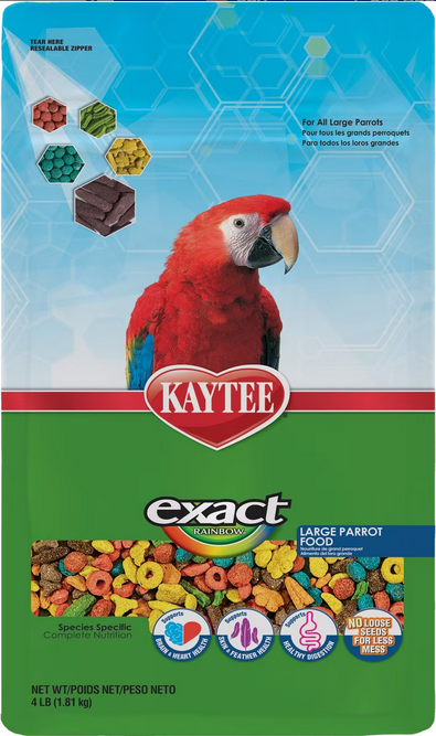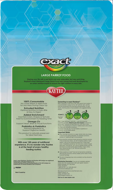 Kaytee Exact Rainbow is a nutritious bird food developed by the nutritional experts at the Kaytee Avian Research Center to provide all the nutrients proven necessary for macaws, cockatoos, all parrots, eclectus, pionus, and large conures. Exact Rainbow combines the highest quality ingredients with added nutrients in a special pasteurizing process to produce an enticing rainbow of life-like colors and shapes.