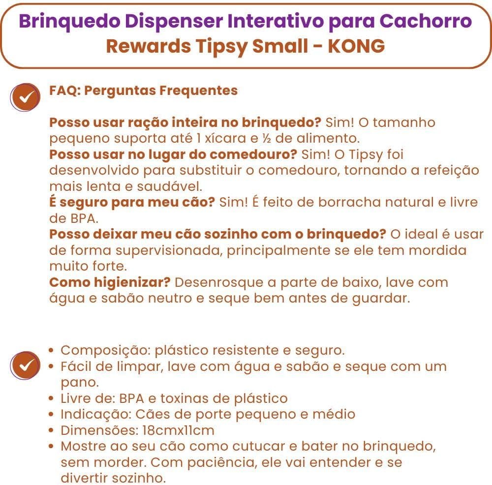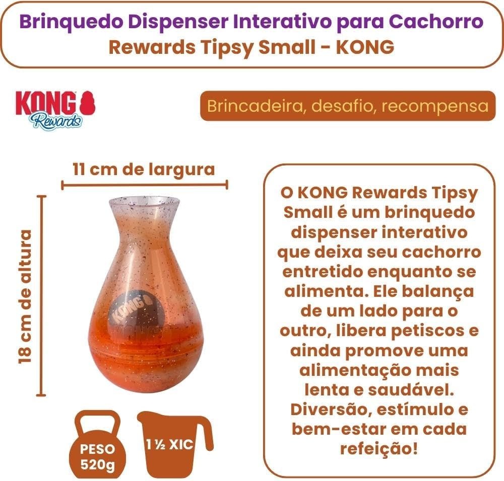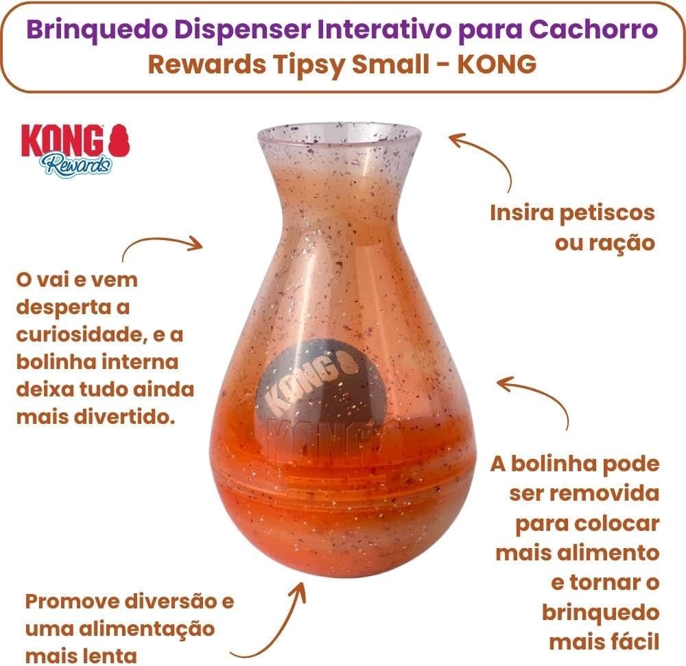 KONG Rewards Tipsy is an action-packed treat or food dispenser designed to keep dogs mentally stimulated, challenged, and rewarded while eating. This toy wobbles as dogs knock it with their nose or paws, spilling food out of the top. A ball inside adds challenge and can be removed by unscrewing the bottom of the toy for an easier reward. Fill with dry, loose treats or food. Ideal for mealtime, snack time, indoor enrichment, and weight loss. Top unscrews for easy cleaning.