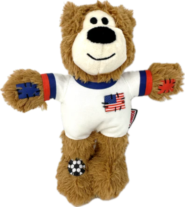 KONG Wild Knots Sport Bear are ready for some soccer! Soft on the outside and tough on the inside—thanks to an internal knotted rope skeleton—this bear is dressed for World Cup fun in their favorite team’s jersey and an embroidered soccer ball. Ideal for satisfying chewing and tugging instincts. Reinforced plush body is great for snuggles if things get too scary. Minimal stuffing means less mess and a squeaker keeps the fun going.