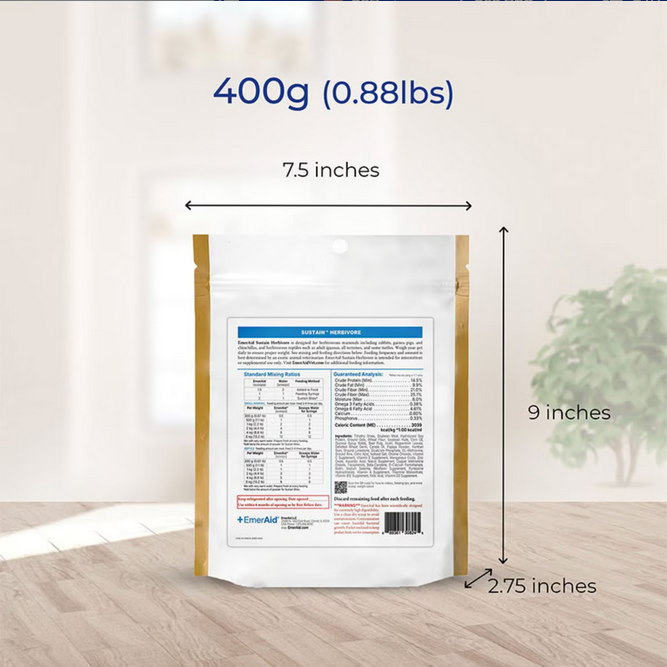 Help your fuzzy friend recover with EmerAid Sustain Herbivore Mint Recovery Food. This complete recovery diet is made with easy-to-digest ingredients and electrolytes to help maintain hydration and health during times of sickness, stress, or injury. Sustain Herbivore is formulated for herbivores of all life stages, including rabbits, guinea pigs, chinchillas, turtles, and iguanas. It’s a great choice for elderly pets, those recovering from critical illness, and herbivores with maldigestion issues, chronic dental/mouth issues, chronic medical conditions, and unexpected weight loss. The powder is easy to mix with water. Serve it as a gravy, round bite, or via syringe—whichever works best for your furbaby.