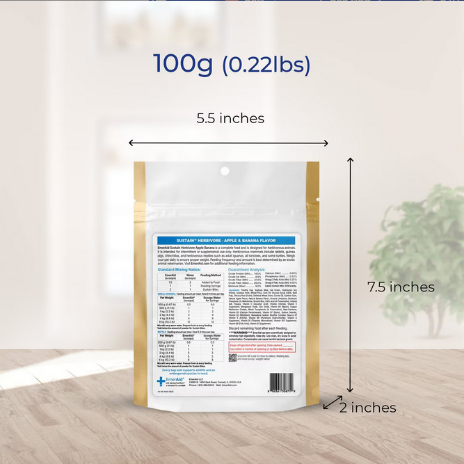 Lafeber EmerAid Sustain Herbivore Apple & Banana Small Animal Recovery Food is the ultimate recovery food for your herbivorous pal. Whether they’re a bunny, guinea pig, chinchilla, turtle, or iguana, this complete and optimal formula is designed to support their health and hydration during times of sickness, stress, or injury. With easy-to-digest ingredients and added electrolytes, this powder can be easily mixed with water and fed in a variety of ways, including as a gravy, round bite, or via a syringe.