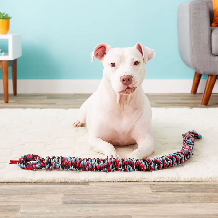 Cotton blend Snakebiter rope tug for dogs. 42-Inch length. Made from premium rope fibers in a fun shape that dogs love. Rope fibers floss dogs' teeth as they chew and play. Great for large-sized breeds. Excellent for strong chewers. Interactive toys are excellent for creating a positive play experience between dog and owner.