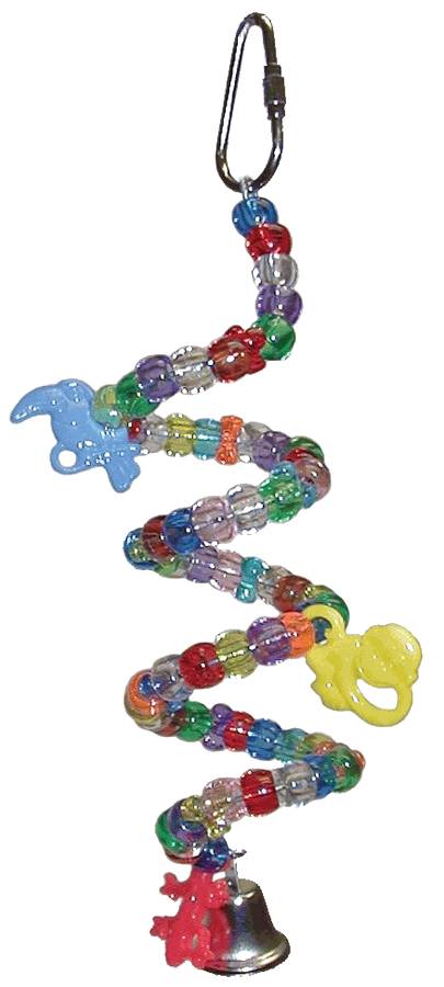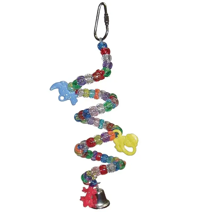 A bendable wire millet holder strung with colorful plastic pony beads and animal charms. A bell at the bottom jingles as the forage!