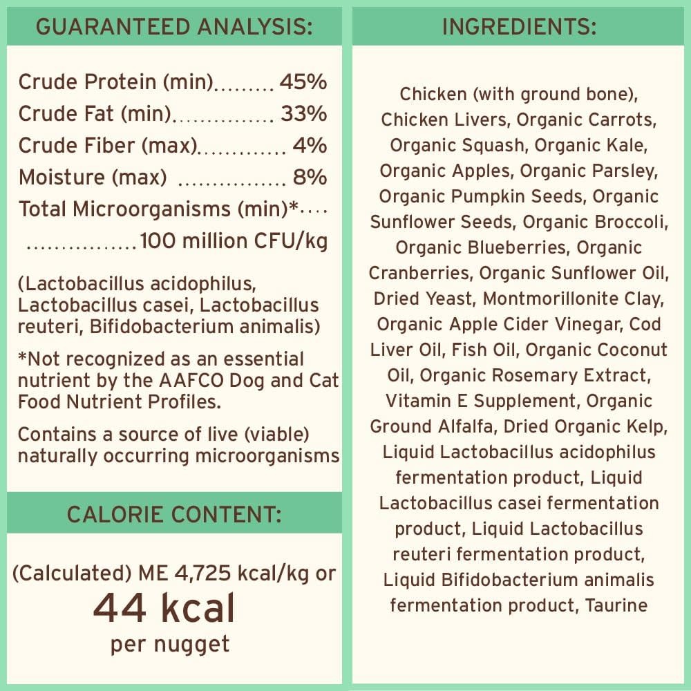 Chicken, Chicken Necks, Chicken Gizzards, Organic Kale, Organic Carrots, Organic Yams, Chicken Livers, Organic Broccoli, Organic Apples, Cranberries, Blueberries, Organic Pumpkin Seeds, Organic Sunflower Seeds, Minerals (Zinc Sulfate, Copper Carbonate, Sodium Selenite), Organic Parsley, Organic Apple Cider Vinegar, Salmon Oil, Organic Coconut Oil, Organic Quinoa Sprout Powder, Dried Organic Kelp, Alfalfa, Natural Vitamin E, Mixed Tocopherols (natural preservative).