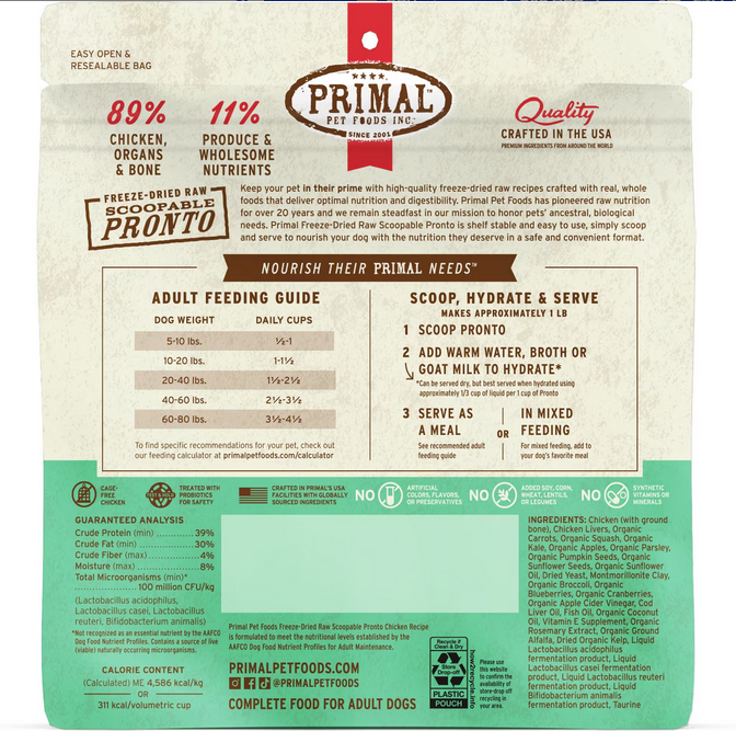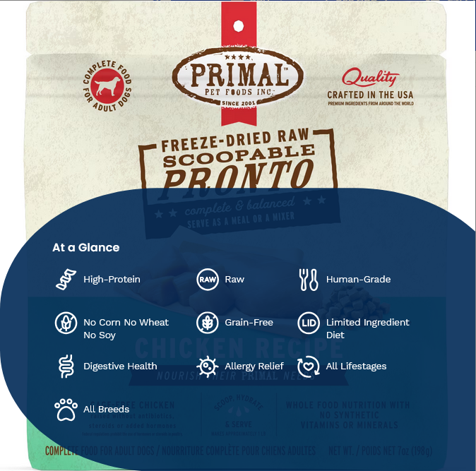 Primal Freeze Dried Raw Dog Food Pronto, Chicken, Complete & Balanced Meal Premium, Grain Free, High Protein, 7 oz