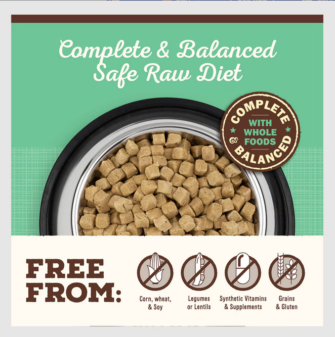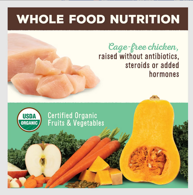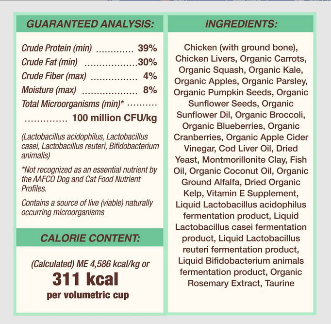 Chicken (with ground bone), Chicken Livers, Organic Carrots, Organic Squash, Organic Kale, Organic Apples, Organic Parsley, Organic Pumpkin Seeds, Organic Sunflower Seeds, Organic Sunflower Oil, Organic Broccoli, Organic Blueberries, Organic Cranberries, Organic Apple Cider Vinegar, Cod Liver Oil, Dried Yeast, Montmorillonite Clay, Fish Oil, Organic Coconut Oil, Organic Ground Alfalfa, Dried Organic Kelp, Vitamin E Supplement, Liquid Lactobacillus acidophilus fermentation product, Liquid Lactobacillus casei fermentation product, Liquid Lactobacillus reuteri fermentation product, Liquid Bifidobacterium animalis fermentation product, Organic Rosemary Extract, Taurine