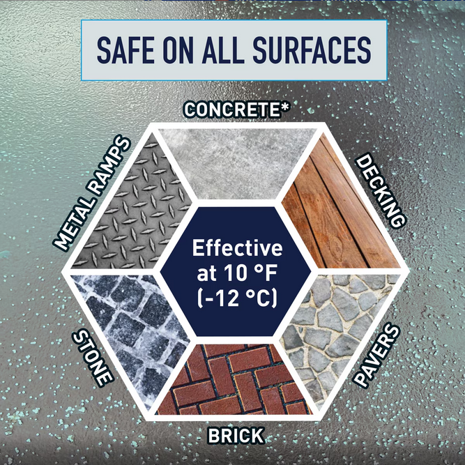 This composition gives Safe Paw a two-way timed released action. The liquid component starts melting ice instantly while breaking surface tension. This allows the crystal-core to penetrate and destabilize ice which speeds up melting. All this while proprietary traction agent provides slip protection.