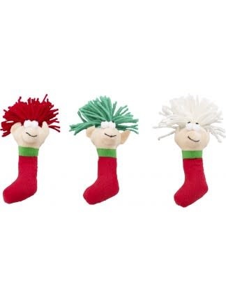 Plush Wooly Elf with stocking body and crazy hair. Contains catnip. 3 color assortment.