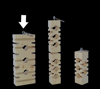 Parrot's Choice Foraging Blocks were designed by enrichment guru Kris Porter. The foraging blocks, available in three sizes, are packed with great features like nested holes and wide cuts that make it easy to insert items like nutriberries and sliced fruits and veggies. Hide the treats behind crinkle shred and tie on some of your bird's favorite toy parts to increase the foraging complexity. The Large Parrot's Choice Foraging Block measures 9" x 3.5" x 1.5" and comes with a nickel plated screw eye and pear link.