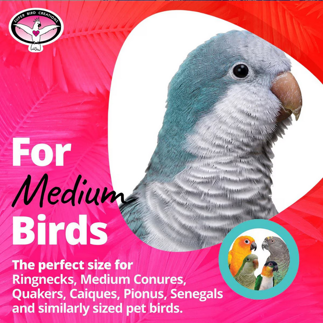 The Maraca Blast will delight your bird's ears with the gentle sounds made by the mini maracas and bell. Colorful coil, tube and flower beads dangle from the plastic wheels perched atop the two birdie balls. This toy is a visual and auditory delight!