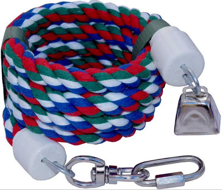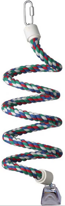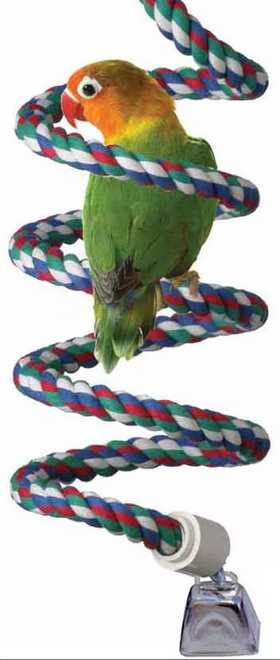 It is a coiled rope perch designed for small birds like Parrotlets, Parakeets, Cockatiels, and Lovebirds. It is made from 100% cotton rope with a bendable internal wire that allows you to reshape its coils or extend its length.