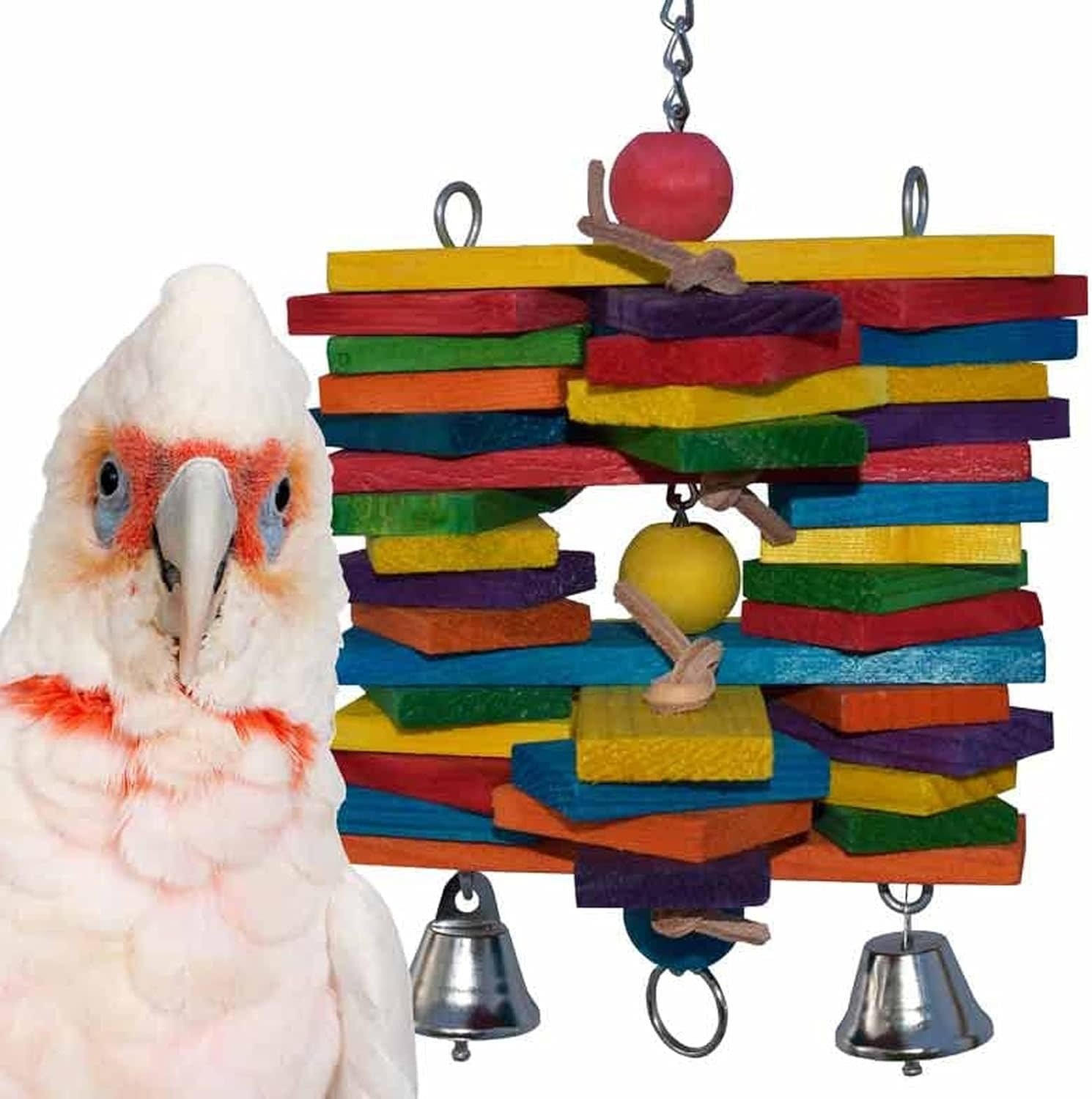 STIMULATING VARIETY OF SHAPES AND TEXTURES: Designed for mental and physical engagement, the Woodpile Bird Toy has a diverse array of brightly colored wooden slats, beads, textures, and layers. Additionally, it incorporates a bell to elevate your bird's auditory experience with its delightful ringing sound. Watch as your bird explores, pecks, and climbs, promoting both exercise and mental stimulation.