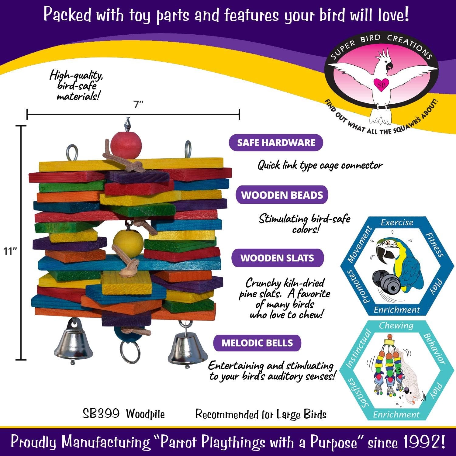 BIRD SAFE COMPONENTS & DESIGN: As avian professionals worldwide recommend our products, we take pride in offering woodpile bird toy that prioritizes the safety and enrichment of pets. Super Bird Creations ensures that only the finest toy components are used, giving bird owners confidence in providing their feathered friends with a product designed for both entertainment and safety. Intended for Pet-Use only.