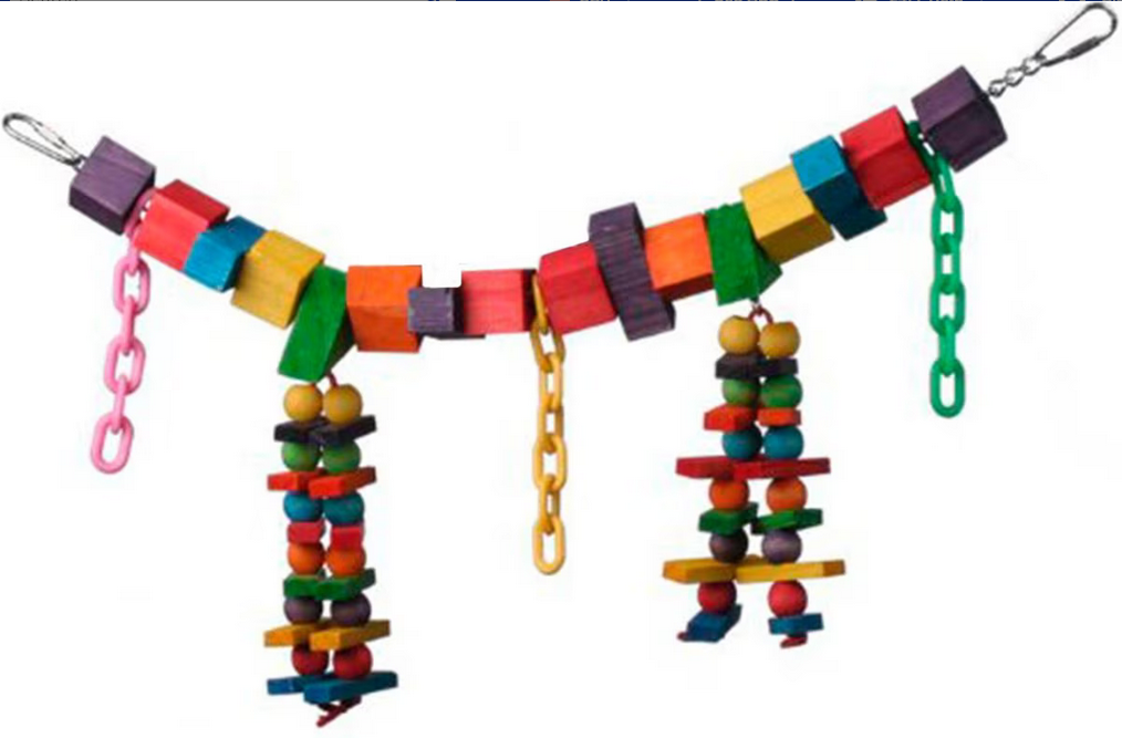 Keep your bird at "beak performance" with the Super Bird Creations Rainbow Bridge Bird Toy! This im-peck-able bridge features colorful wooden blocks and beads with hanging plastic chains and pacifiers for even more enticing variety. The fun, destructible design encourages healthy chewing habits and boredom-busting exercise. Plus, you can hang it vertically or horizontally—whichever your pal prefers!