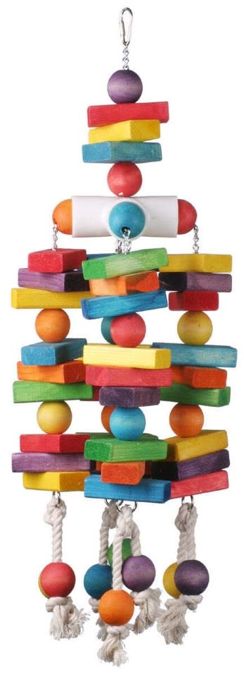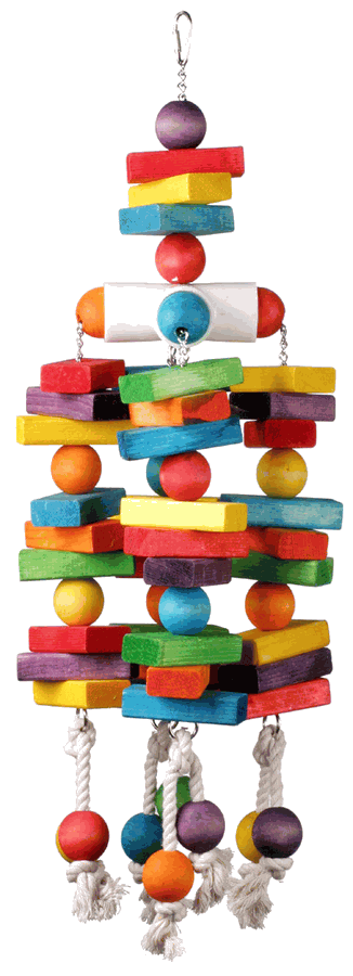 Your bird will enjoy chewing his through the four strands of colorful pine blocks dangling on chain from a central PVC core. Adorned with wooden beads on 100% cotton rope.