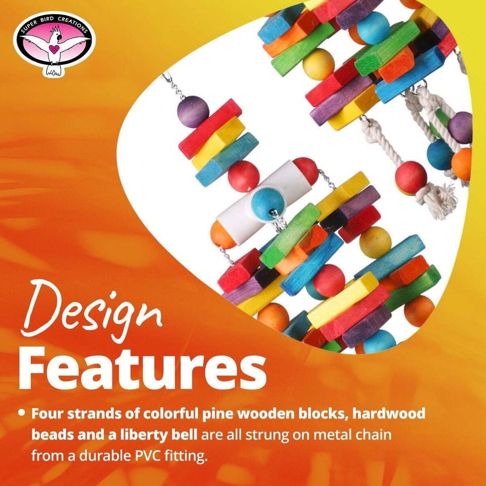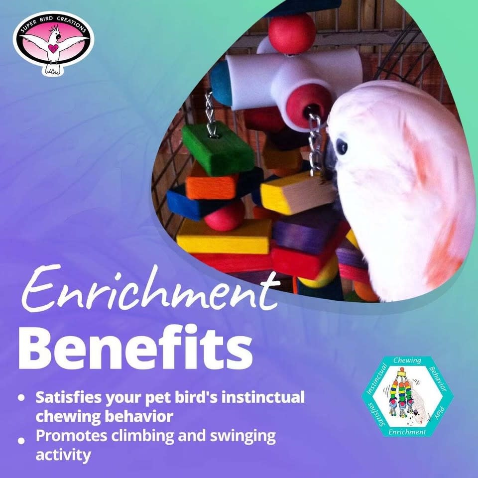 - Super Bird Creations toy designs use a diverse selection of stimulating bird-safe materials to ensure the mental and physical well being of pet birds