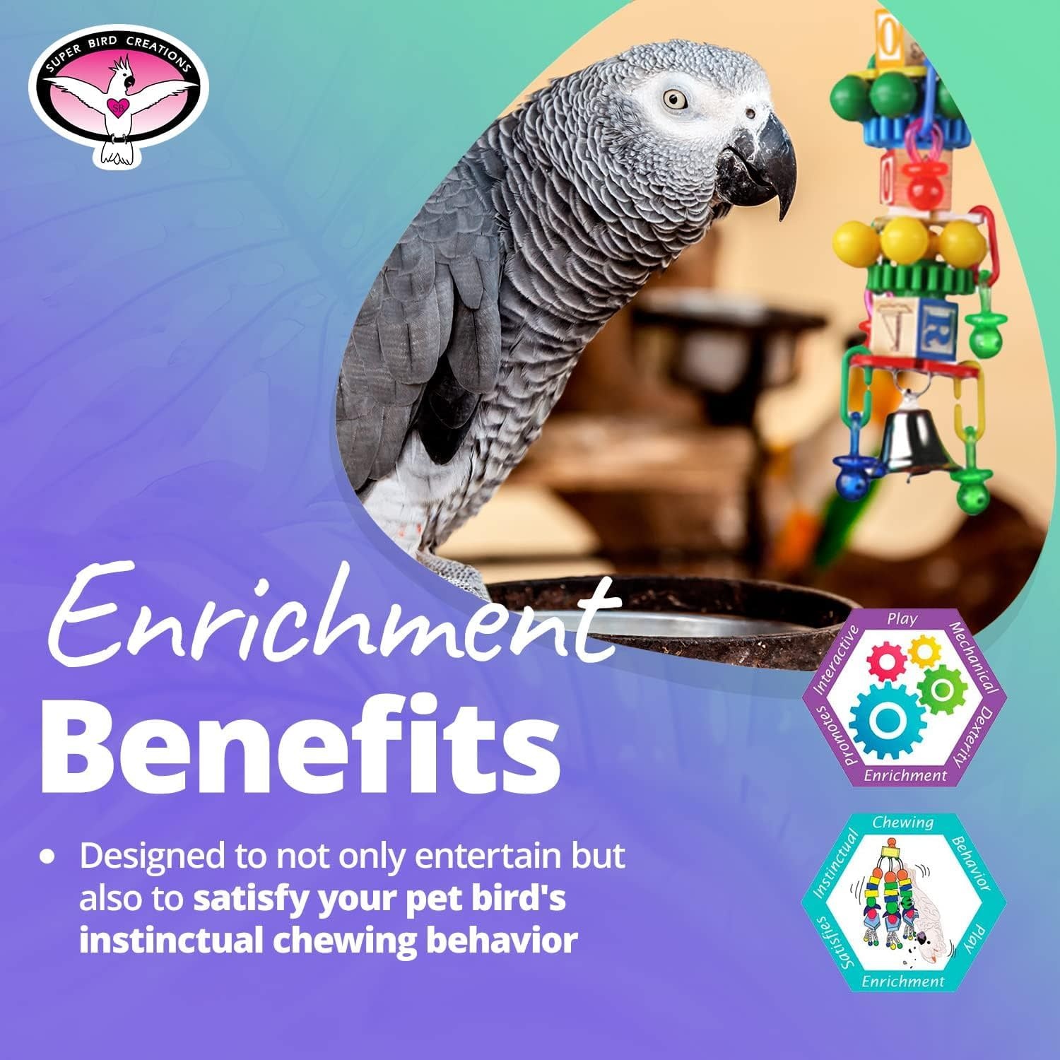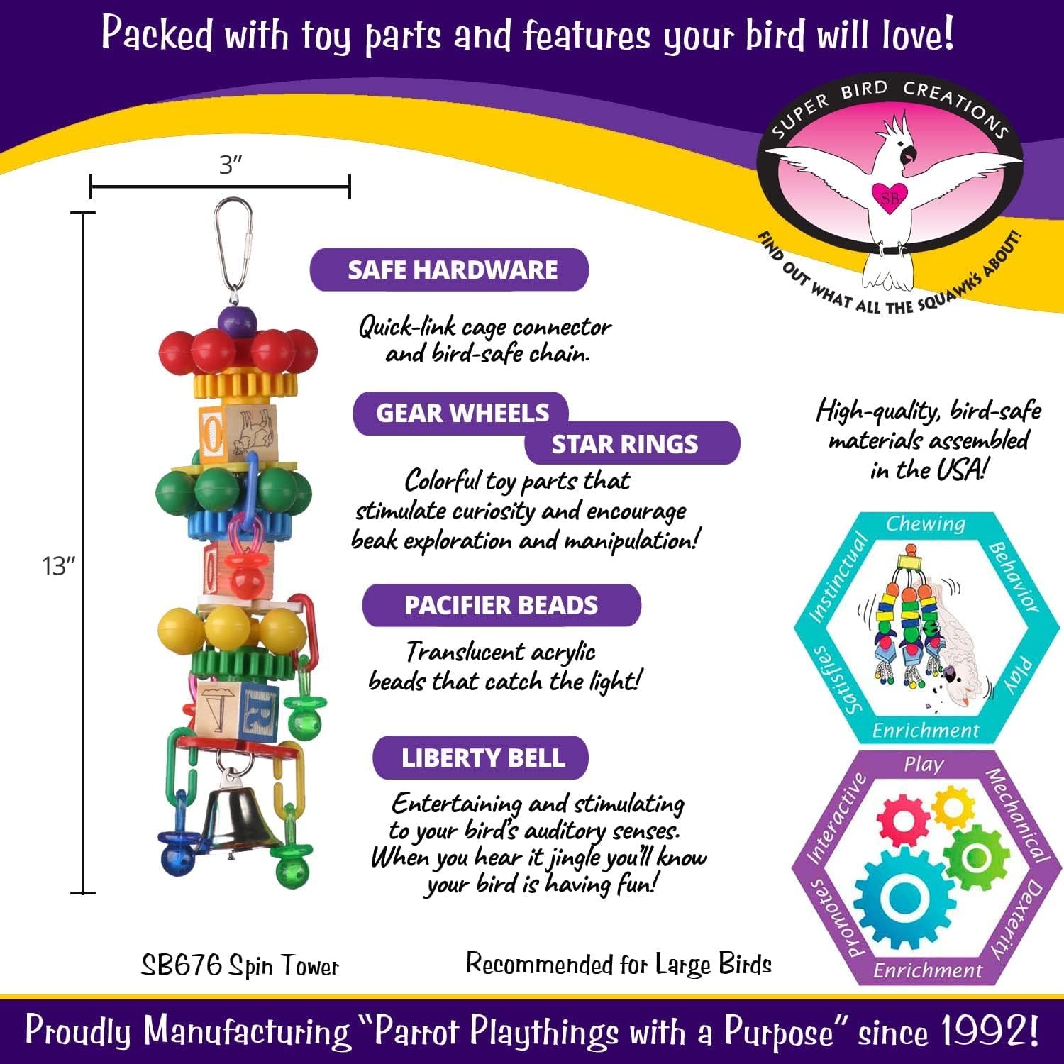 MENTAL AND PHYSICAL ENRICHMENT: Engage your bird in vibrant, stimulating play with the Super Bird Creations Spin Tower. This toy is a feast for the senses, offering healthy exercise and cognitive stimulation through its colorful gear wheels, puff stars, and dangling acrylic pacifiers, fostering interactive fun and physical activity.