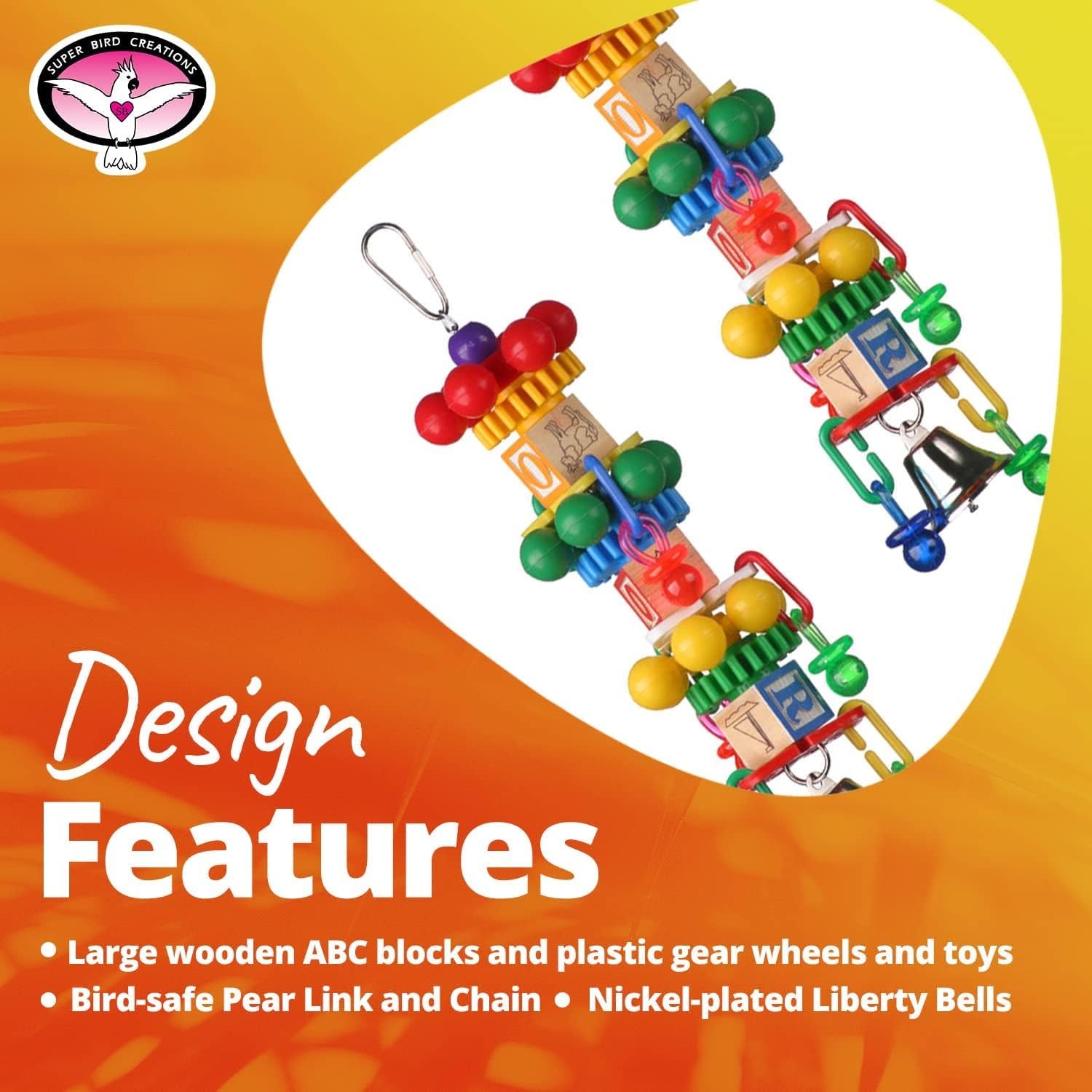 BUILT TO SUSTAIN FUN: Meticulously designed with parrot playfulness in mind, the Super Bird Creations Spin Tower features tough wooden ABC blocks and resilient plastic gears. This toy ensures prolonged entertainment, enduring the most enthusiastic beak-induced destruction with resilience.