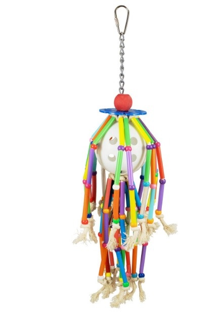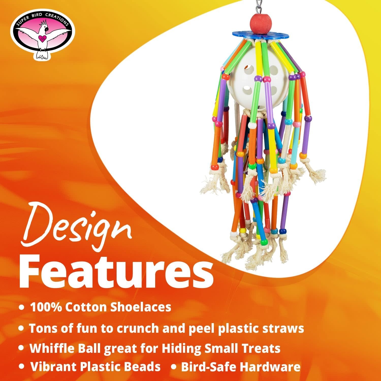 DESIGN FEATURES - A ton of fun is packed into the Squiggy bird toy with all the crunchy straws that are strung on 100% cotton shoelaces that dangle around the whiffle ball core. Attaches to the cage with a bird-safe pear link.