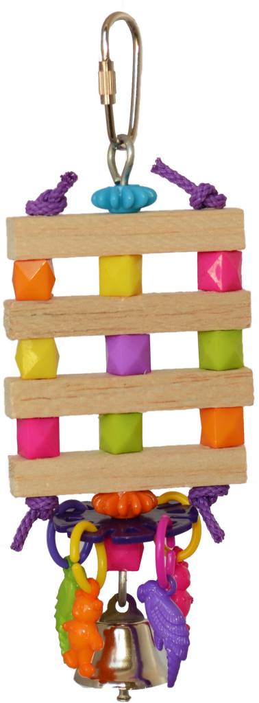 a colorful, chewable bird toy designed for small birds like Parrotlets, Parakeets, Cockatiels, and Lovebirds, featuring easy-to-chew balsa wood, bright plastic beads, and charms for beak maintenance, mental stimulation, and developing dexterity. It provides textures for climbing and chewing, helping to relieve boredom and promote healthy bird behavior.