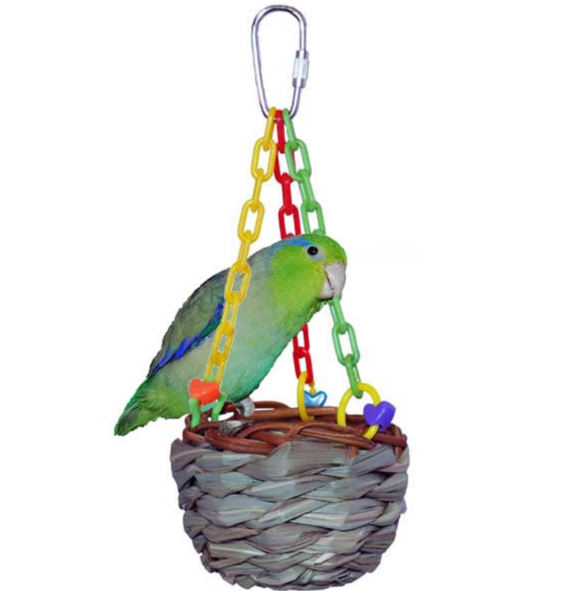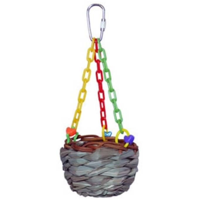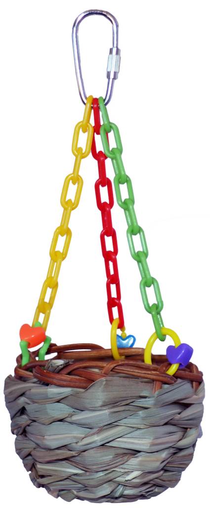 Adorable mini seagrass bowl suspended by colorful plastic chains. Stuff with a favorite treat to create a foraging toy for more fun.