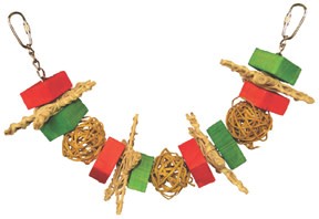 The Small XMAS Garland toy provides a colorful jumble of wood beads, vine stars, vine balls, and tiny balsa blocks for festive fun. This is a wonderful toy for small chewers allowing for lots of fun nibbles.