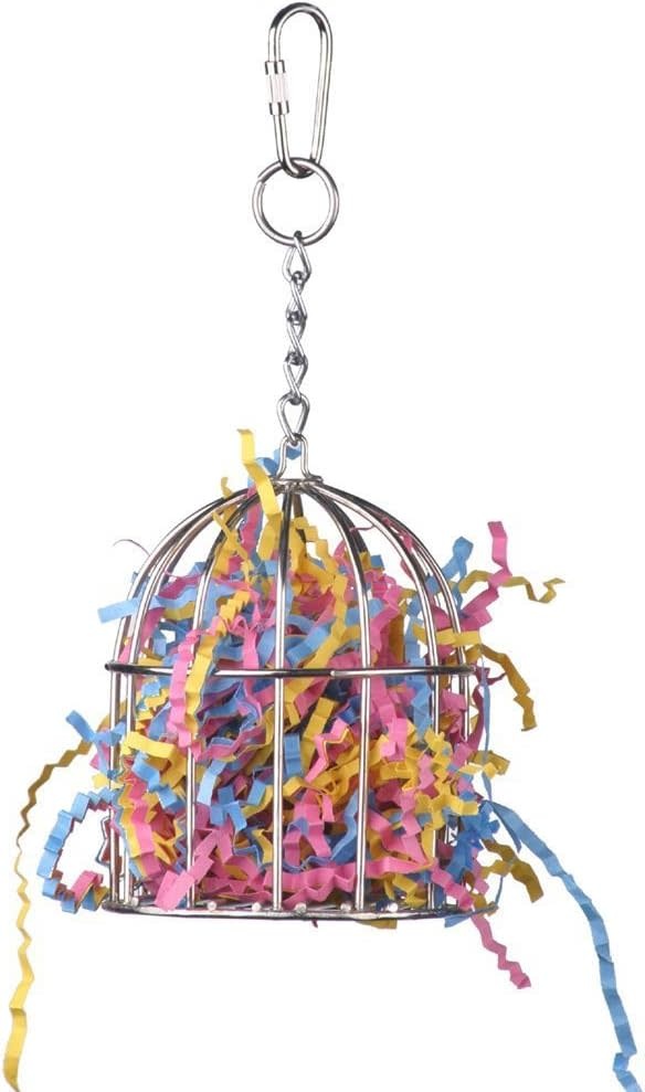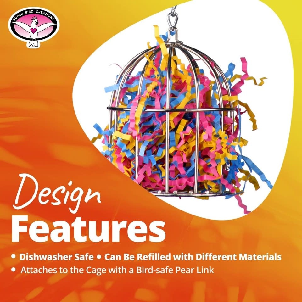DESIGN FEATURES – Mini Stainless Steel Treat Cage bird toy is dishwasher safe and can be refilled over and over again with crinkle shred, toy parts and even better....nuts, fruits and veggies. Attaches to the cage with a bird-safe pear link.