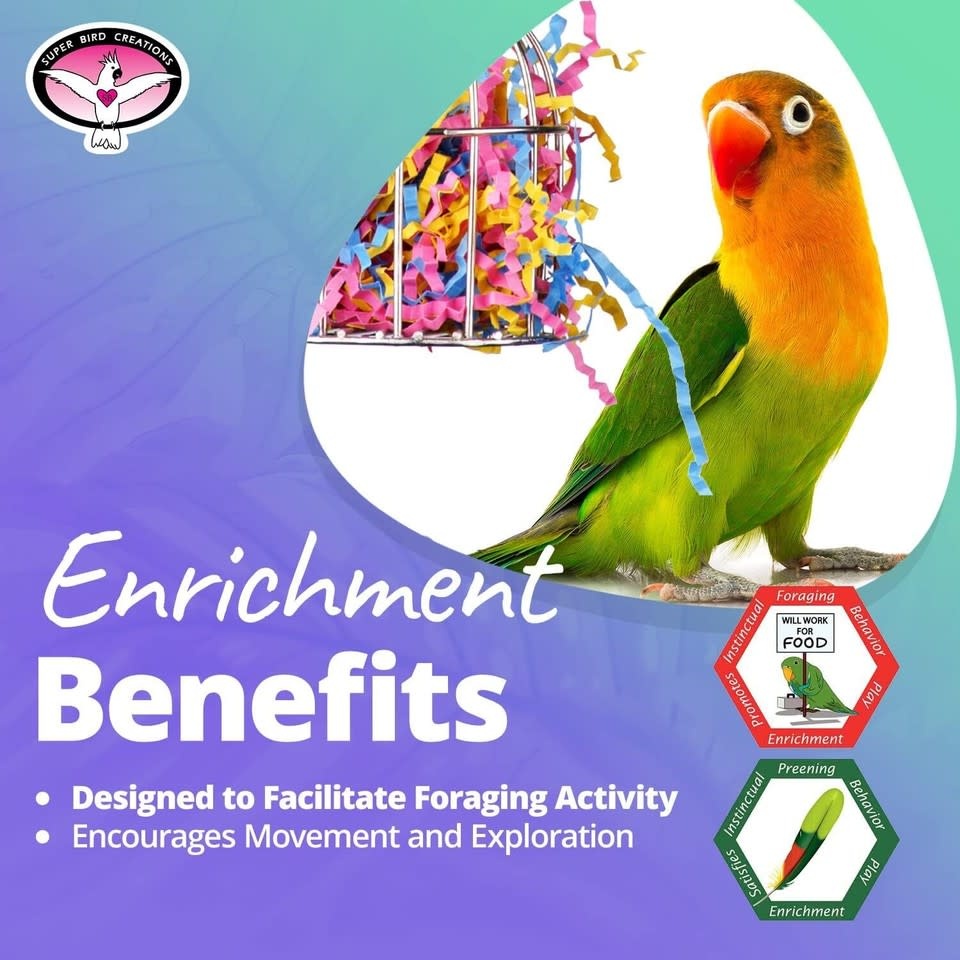 FOR SMALL TO MEDIUM BIRDS - The Mini Stainless Steel Treat Cage bird toy by Super Bird Creations is the perfect size for Parrotlets, Parakeets, Cockatiels, Lovebirds, Ringnecks, Medium Conures, Quakers, Caiques, Pionus, Senegals and similarly sized pet birds.