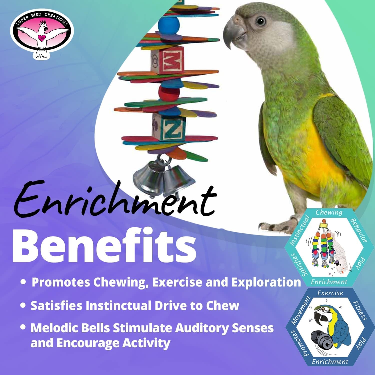 - IDEAL FOR MEDIUM BIRDS: Crafted for birds like Ringnecks, Conures, Quakers, Caiques, Pionus, Senegals! Super Bird Creations ABC Spoon Stack Toy provides engaging entertainment & exercise, minimizing cage stress & boredom.