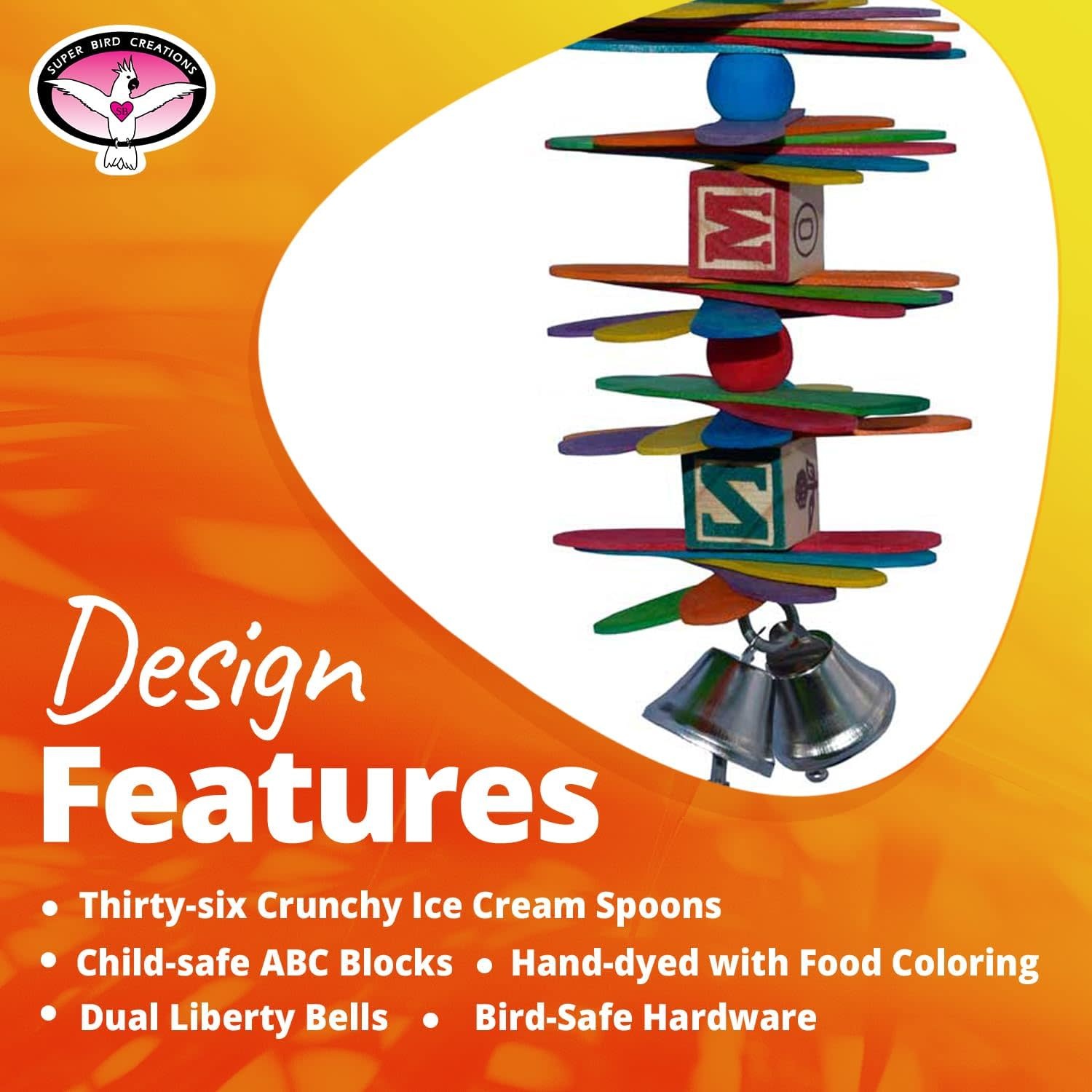 - VIBRANT ABC SPOON STACK TOY: 36 colorful ice cream spoons, wooden ABC blocks, wood beads, and two bells provide lively visual stimulation. Watch your bird explore the textured alphabet blocks, fostering mental stimulation and curiosity.